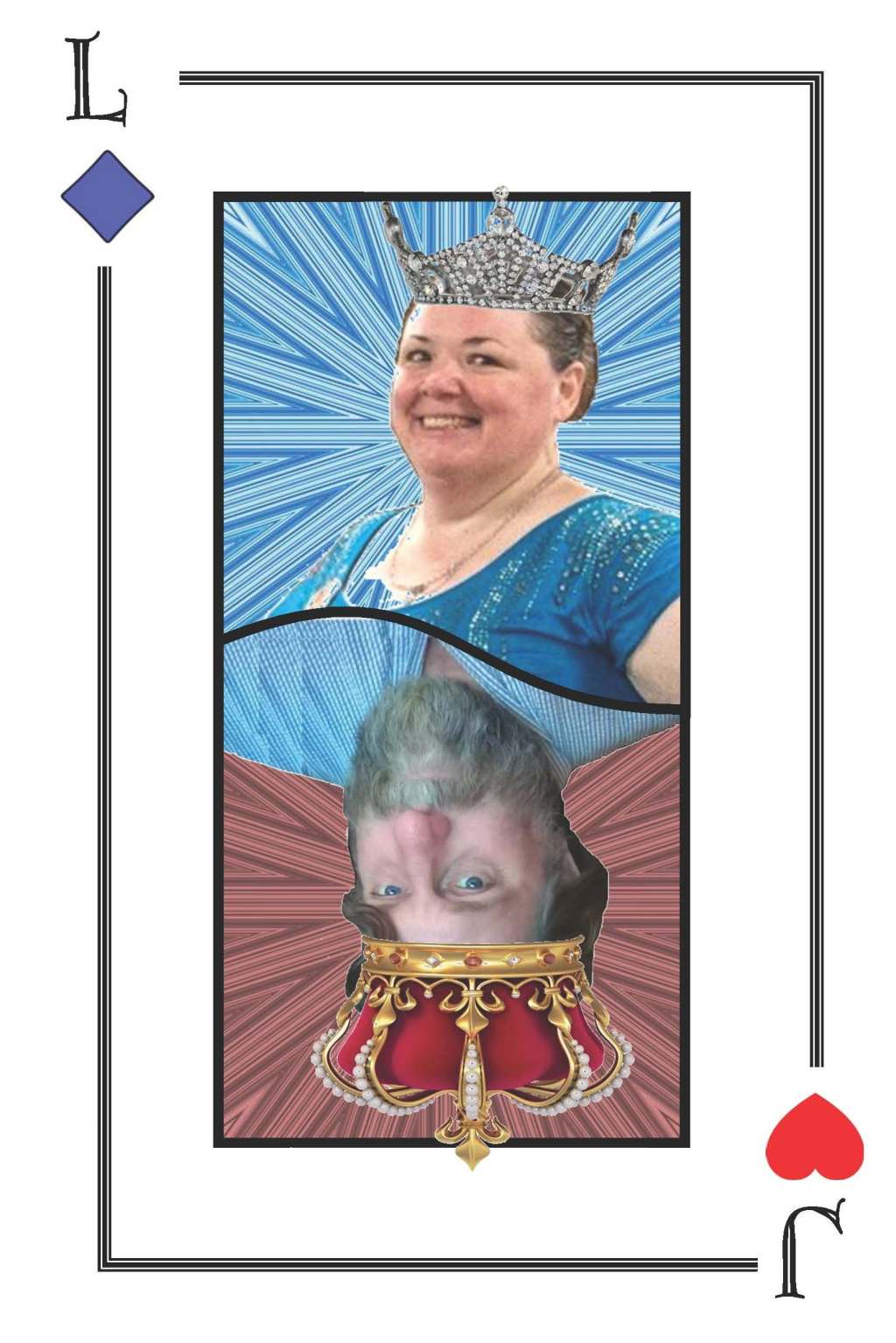 Next, I started laying out a flyer, thinking of a theme of playing cards, which have black and red suits, and we could be King and Queen of our birthday party. Lisa wasn’t a fan of decorating with black, and suggested blue. She also made the suggestion of using the suits of playing cards as gender-free terms. Gendered terms, men/women or gents/ladies, have a one and two syllable pattern. Our main caller for the dance, Linda Leslie, suggested the pair [hearts and diamonds], which fit the pattern nicely. And “who doesn’t like diamonds and hearts?” No objections here. It seemed to make more sense to have blue diamonds rather than blue hearts. That would be depressing.