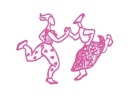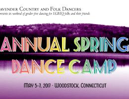 This postcard was created for the promotion of the spring dance camp, an annual event of the Lavender Country & Folk Dancers (LCFD). LCFD is an organization that promotes gender-free community dancing, with a focus on contra and English country dance. The dance weekend is held at a YMCA camp in Woodstock, Connecticut. FUN…